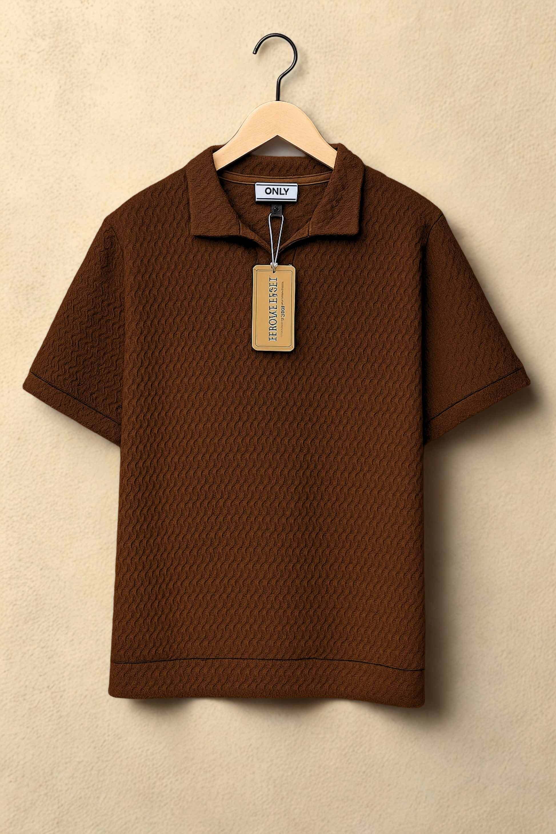 The shirt features a signature ripple-wave texture that runs seamlessly across the body, collar, sleeves, and hem – giving it a unique 3D depth you won’t find in regular polos. The open V-neck collar adds a relaxed yet sophisticated edge, while the ribbed sleeve ends and hem ensure a sharp, tailored finish.